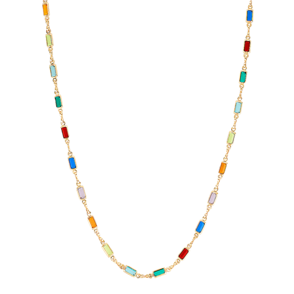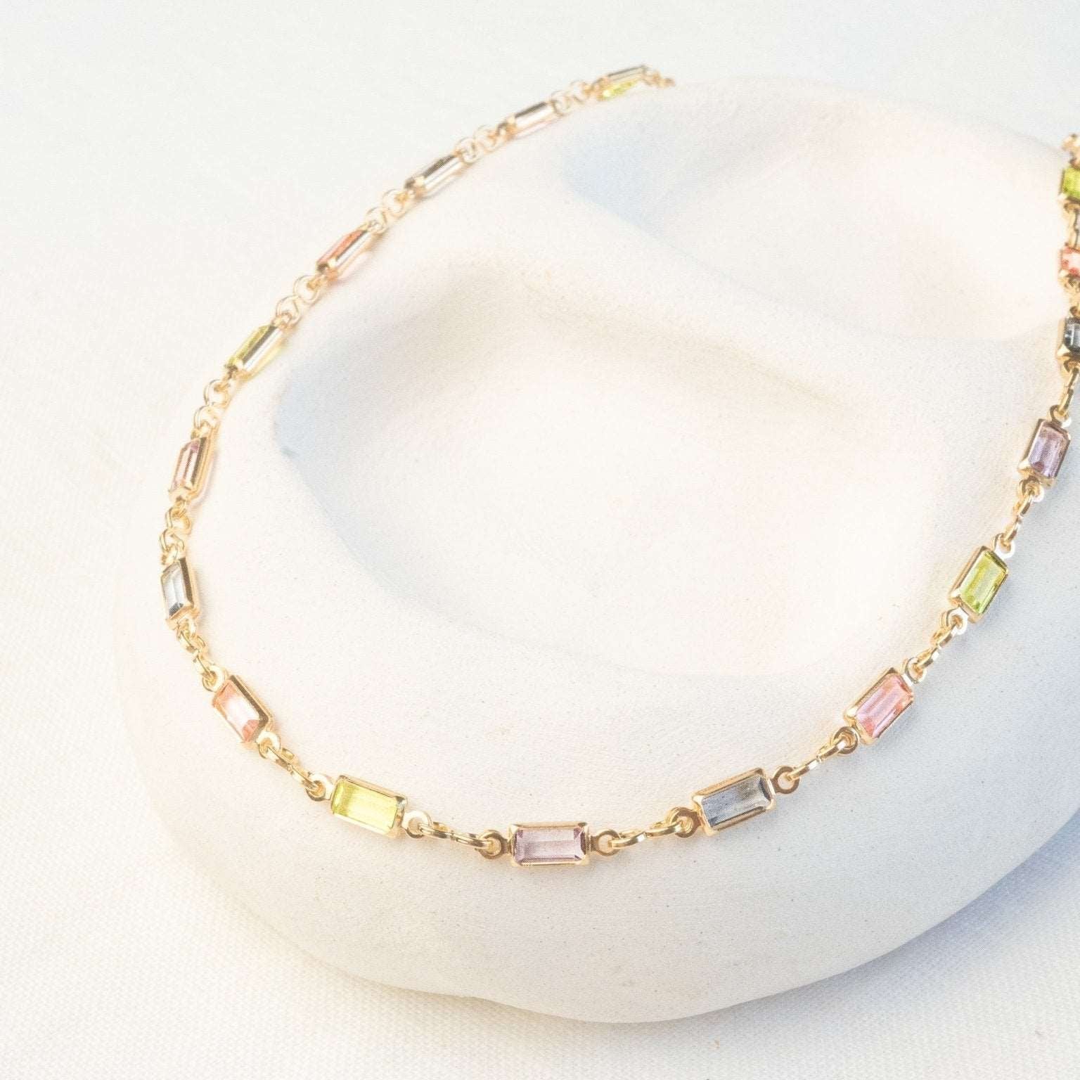 The Rainbow Necklace Slim, the perfect accessory for anyone who loves a pop of colour. Made with delicate glass gemstones and 18k gold fill connectors, this necklace is a true work of art. Each gemstone tells its own unique story. This dainty necklace is also available in two different multicoloured schemes: pastel and vibrant shades.
