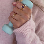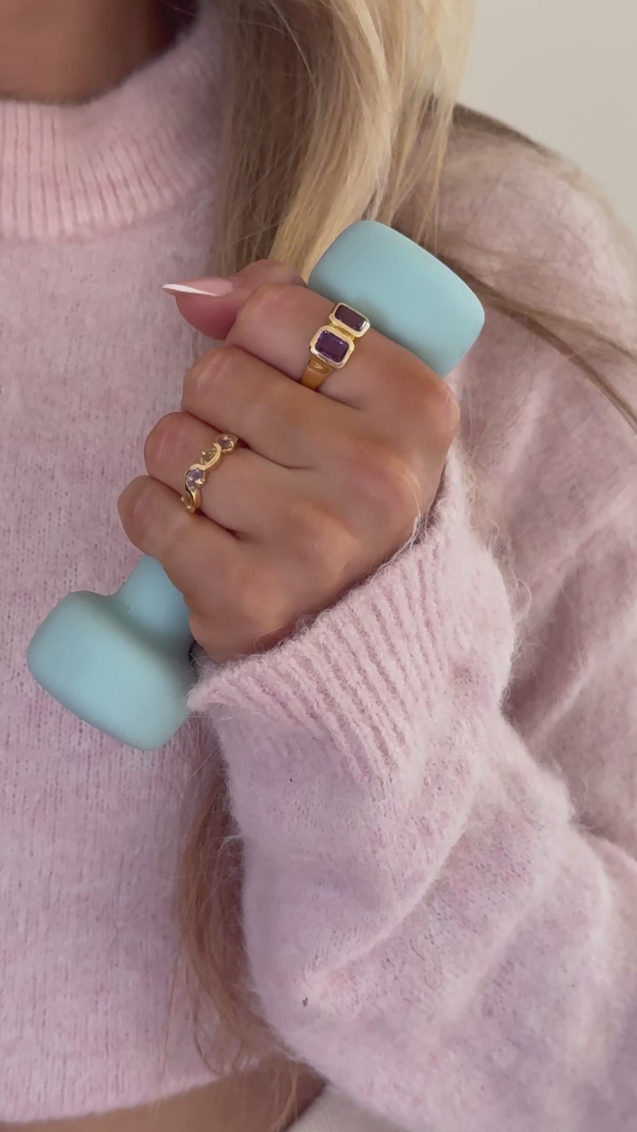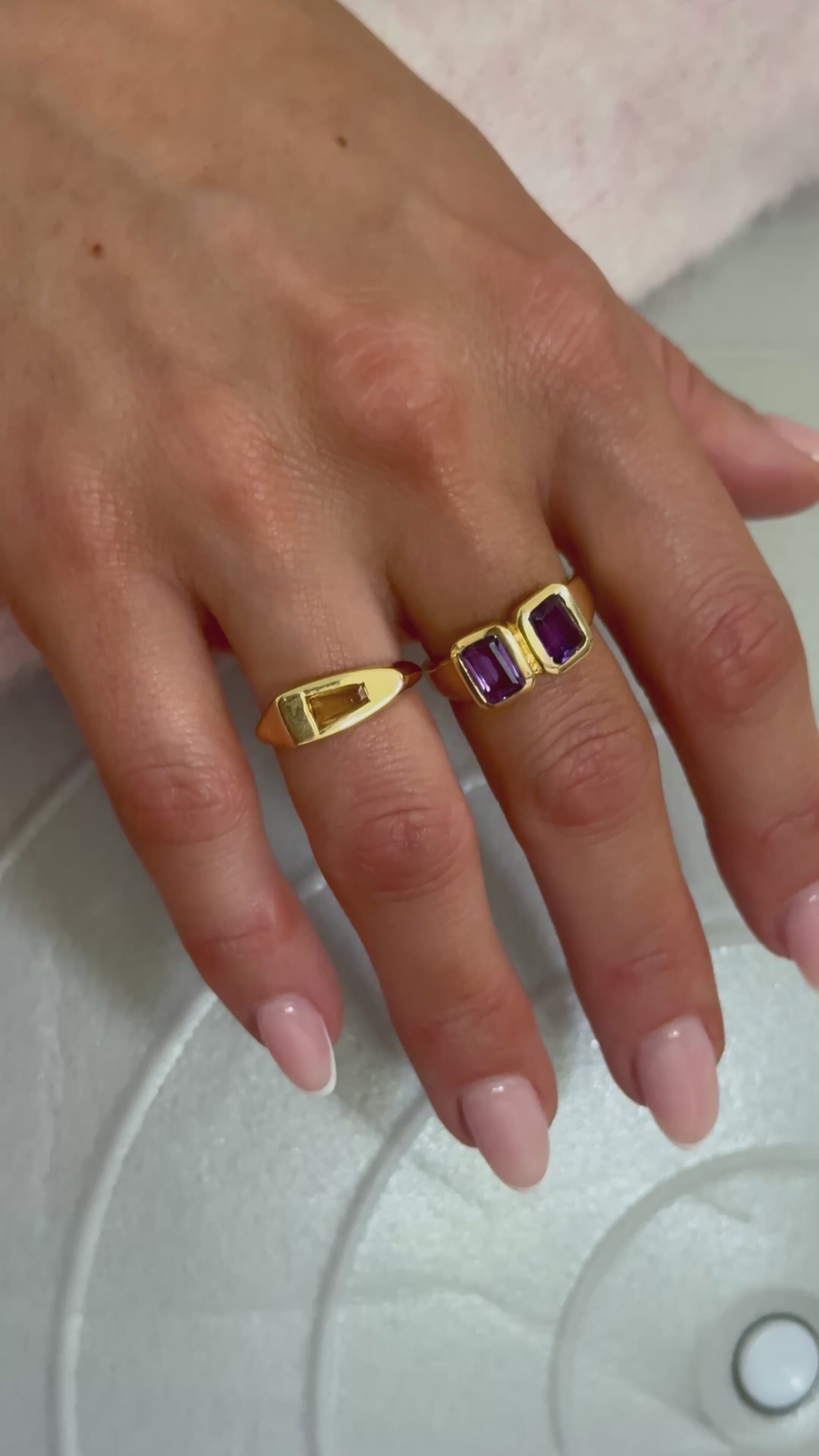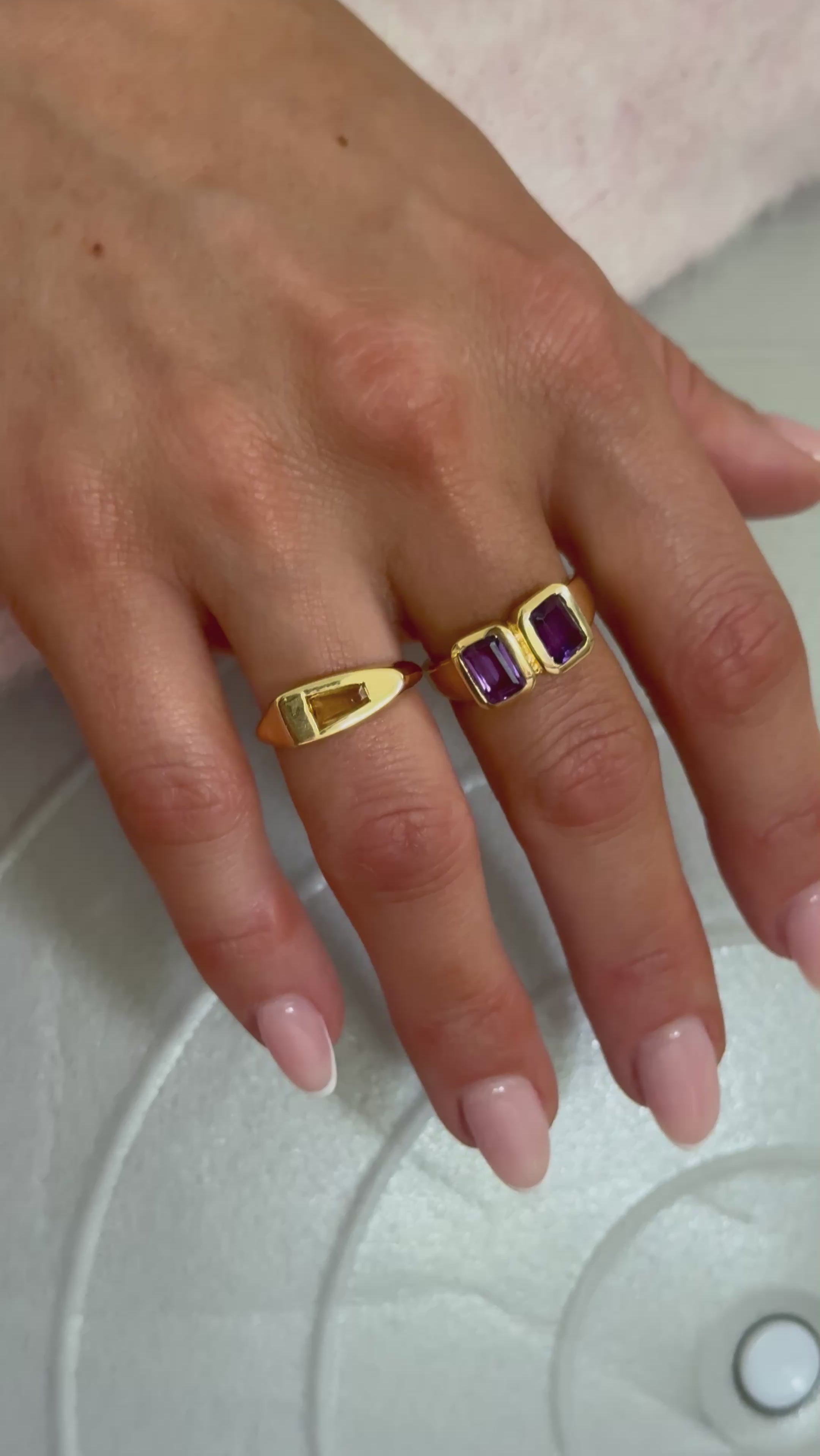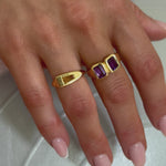 The Vesper Ring is a statement of bold sophistication. Imagine two large rectangular baguette-cut amethyst gemstones sitting side by side on a lustrous 18k gold vermeil band—creating a striking focal point that commands attention. The deep, regal purple of genuine amethyst catches the light with every movement, making this ring an instant conversation starter.
