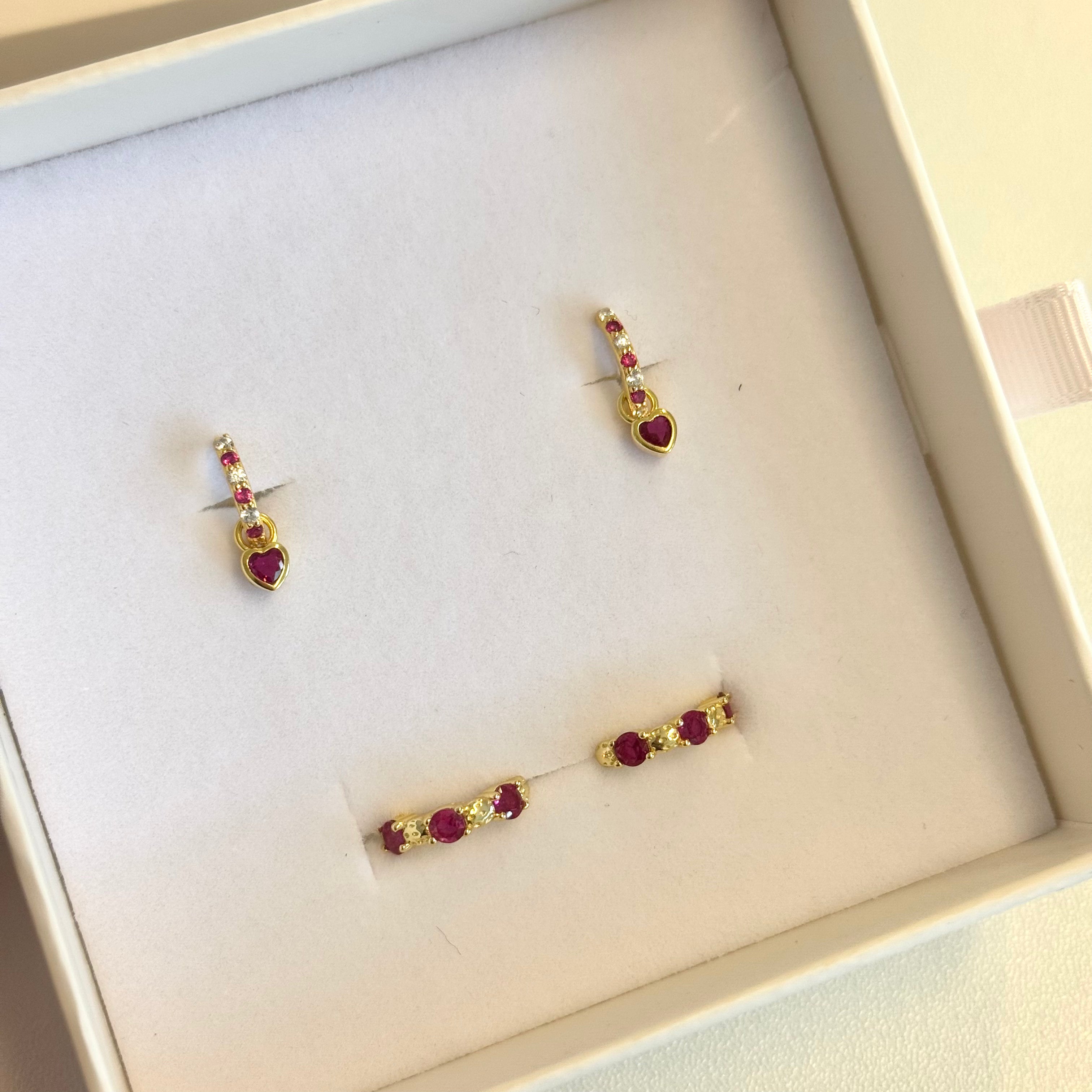 Gold hoop earrings with pink heart-shaped stones on a white background