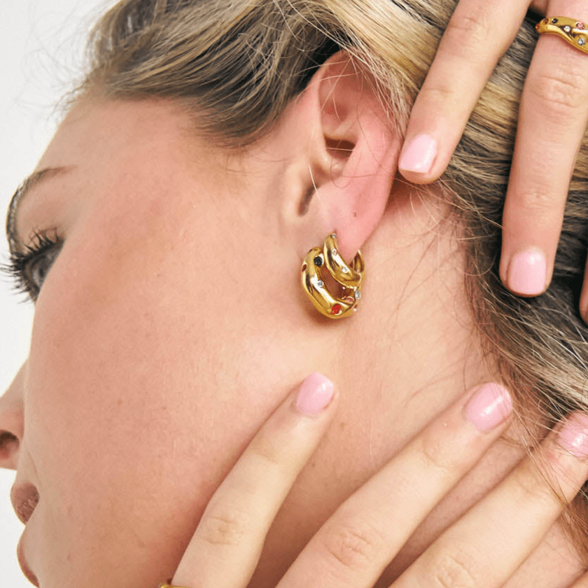 Introducing the Nymph Huggies, the perfect accessory for any occasion! These little gems are like treasures for your ears, but don't worry, they won't weigh you down. With their small size and tiny multicoloured gemstones, they add an exciting pop of colour to any outfit.