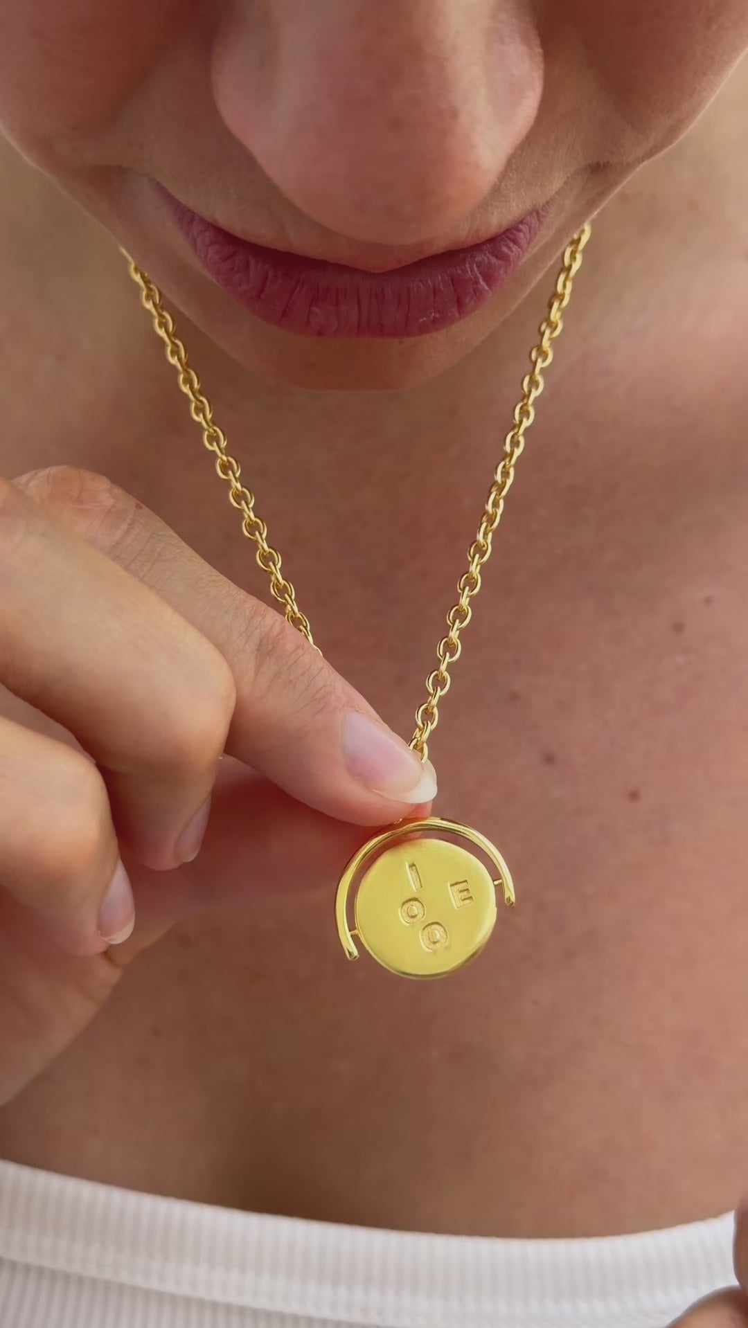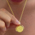 Gold necklace with a round pendant held by a hand