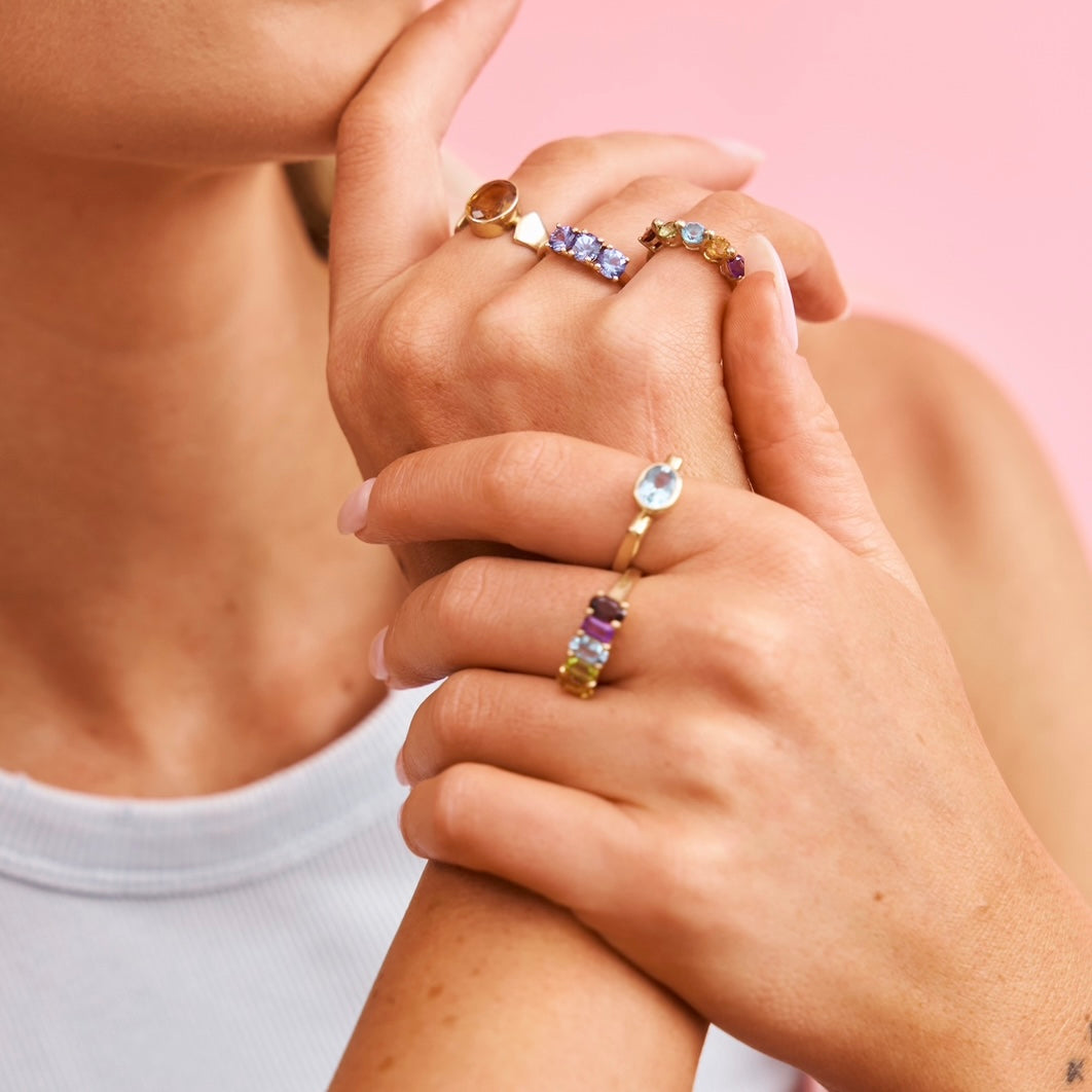 A dazzling solid 9k gold piece US size 8, set with glowing Amethyst, Blue Topaz, Peridot, Red Garnet and vintage Orange Garnet (rumoured to have matched her favourite silk dresses), this ring is a celebration of rebellion, freedom, and fun.